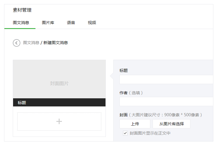 進入“素材管理”頁面可直接新建圖文消息,運營者無須決定新建單圖文或多圖文。