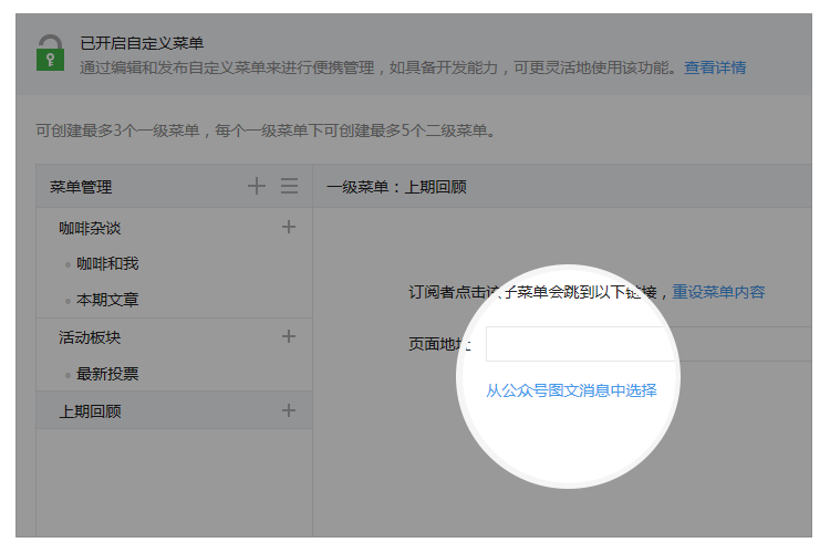 三、自定義菜單:內(nèi)鏈支持歷史消息和頁面模版
