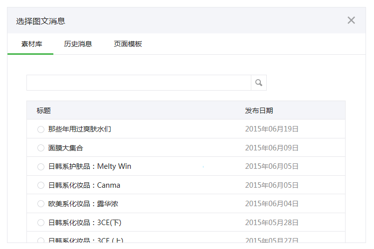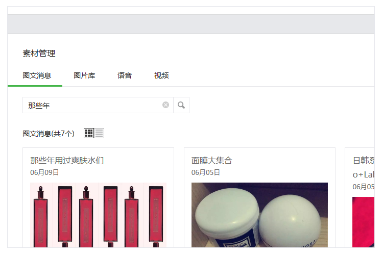 除用戶管理的搜索功能外,素材庫圖文消息和消息管理的搜索功能體驗上保持一致,輸入框內(nèi)提示已支持的搜索內(nèi)容。