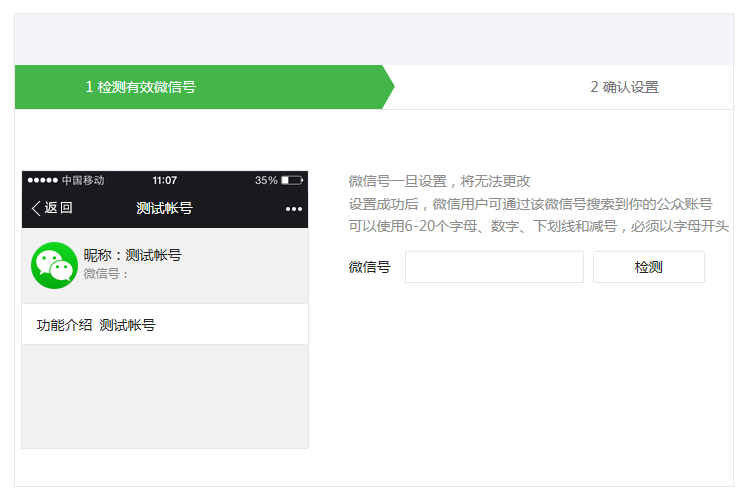 當新帳號信息審核通過后,可在“公眾號設置”進行微信號設置。運營者可先檢測預設的微信號是否可用,若可用再進行下一步操作。此外,設置微信號時,運營者直接可見微信內(nèi)該公眾帳號的微信號展示效果,提升用戶對微信號的理解。