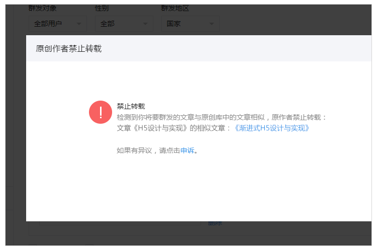 3. 設(shè)置為禁止轉(zhuǎn)載的文章,所有公眾號(hào)無法轉(zhuǎn)載。
