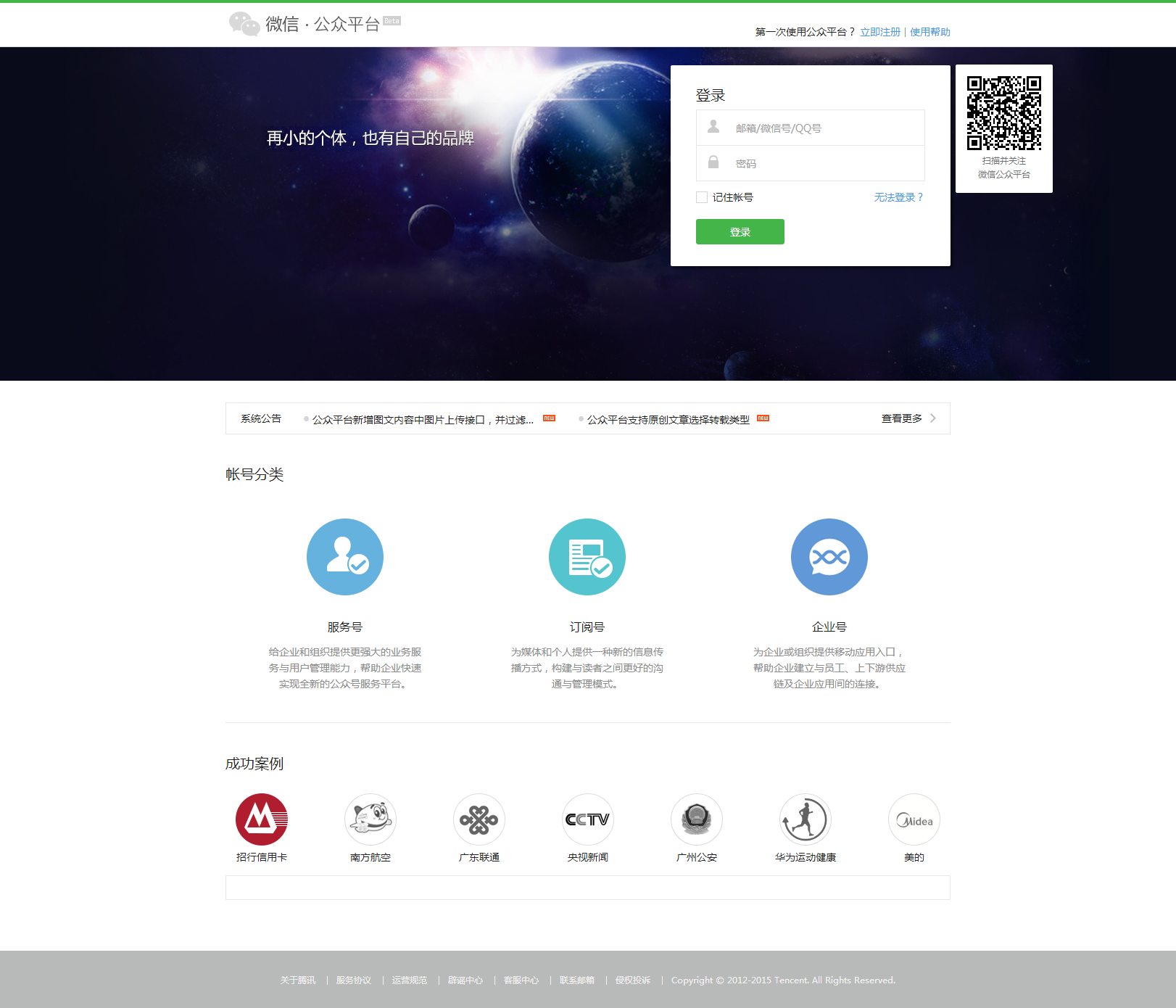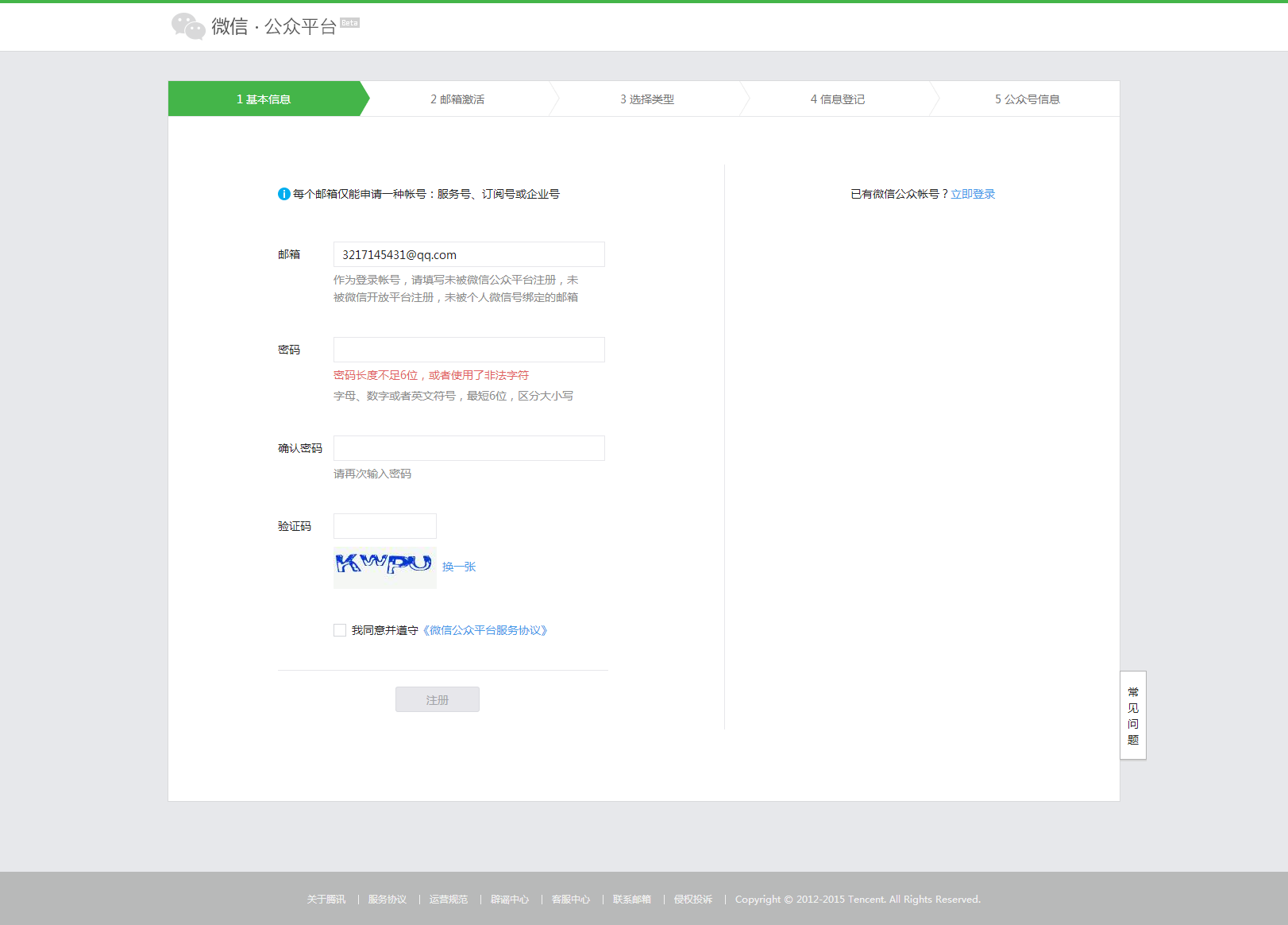 2、注冊過QQ賬號(hào)以后,登錄到https://mp.weixin.qq.com/的頁面,進(jìn)行企業(yè)微信服務(wù)號(hào)的注冊。如圖:
