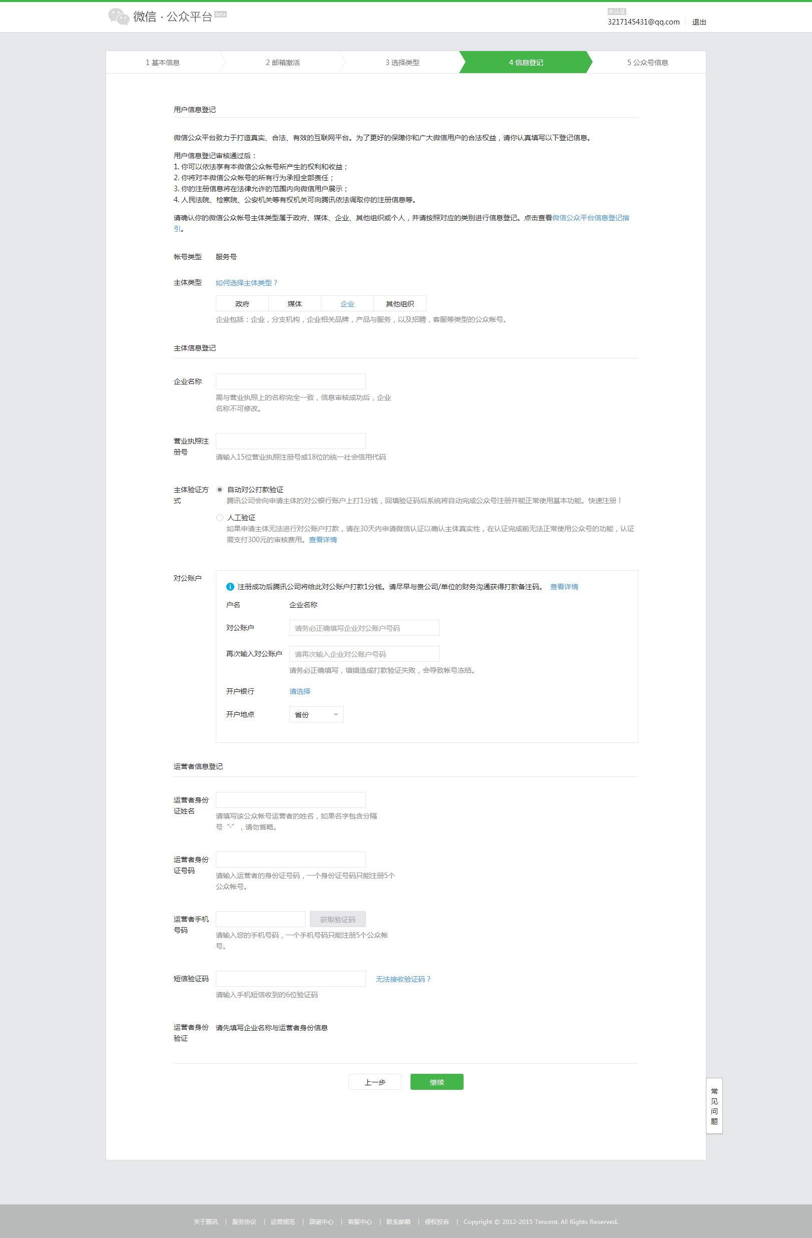 7、當(dāng)選定“企業(yè)”以后會(huì)出現(xiàn)一個(gè)新的頁面,我們按照頁面的要求填寫信息即可,但是要保障填寫的信息都是真實(shí)的。或許有些人對(duì)于對(duì)公賬戶比較的困惑,在此,天津網(wǎng)站建設(shè)-文率科技的小編特意為大家說下對(duì)公賬號(hào),其實(shí)就是填寫您的銀行卡賬號(hào),主要是因?yàn)楫?dāng)您所有的注冊程序都完成以后,微信公眾平臺(tái)會(huì)向您的對(duì)公賬號(hào)中打入1分錢,同時(shí)還會(huì)給您發(fā)一個(gè)六位數(shù)的驗(yàn)證碼,這個(gè)驗(yàn)證碼的作用等會(huì)給大家解說,先看下圖: