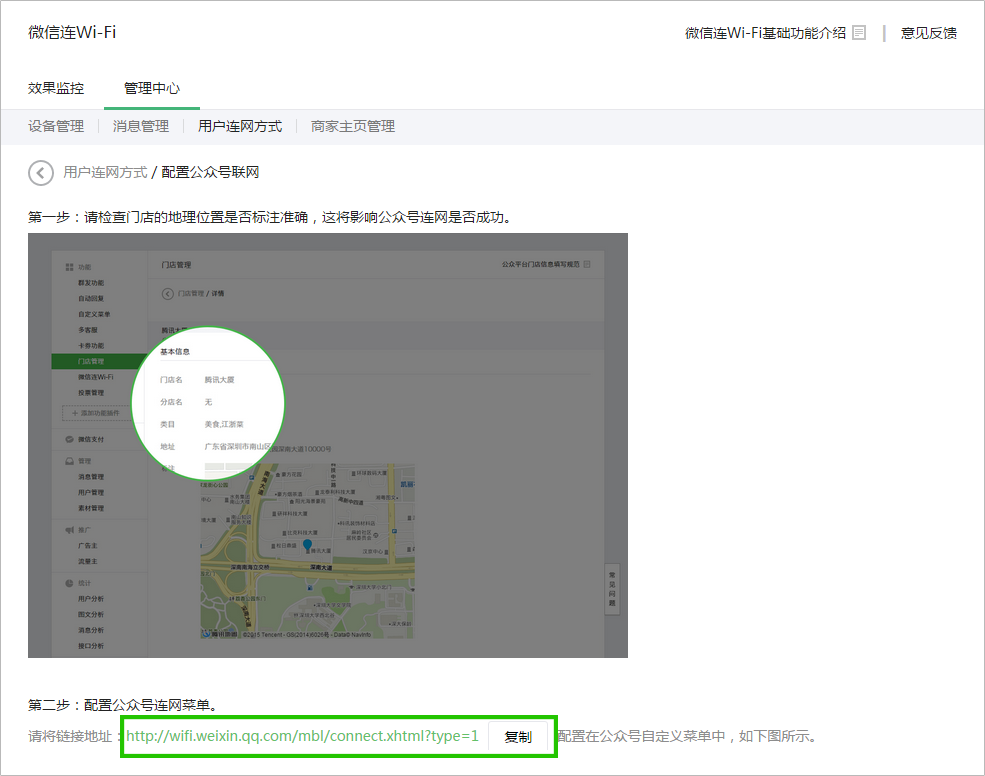 3、獲取公眾號(hào)上網(wǎng)鏈接,并自行配置到公眾號(hào)菜單,即可點(diǎn)擊菜單連接WiFi。