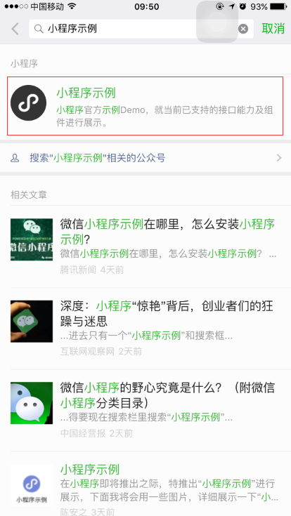 2、在微信的⑴個(gè)頁(yè)面頂端,有一個(gè)搜索條,在搜索條里輸入:小程序示例,然后點(diǎn)擊搜索。