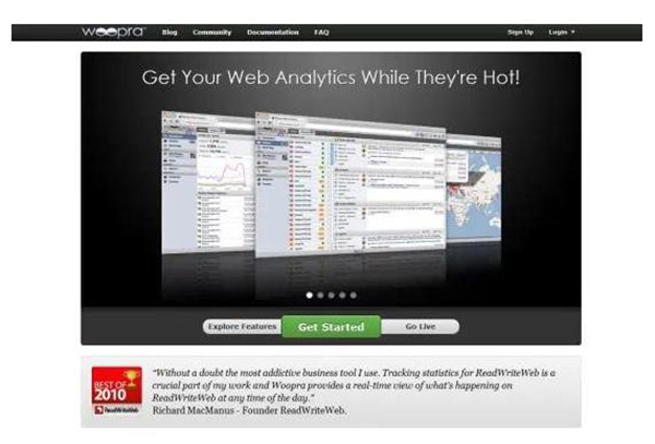 Woopra的出現(xiàn)將實時統(tǒng)計帶到了另一個層次,它能實時直播網(wǎng)站的訪問數(shù)據(jù),你甚至可以使用Woopra Chat部件與用戶聊天。不僅如此,另外,Woopra還擁有先進的通知功能,可讓你建立各類通知,如:電子郵件、聲音、彈出框等。