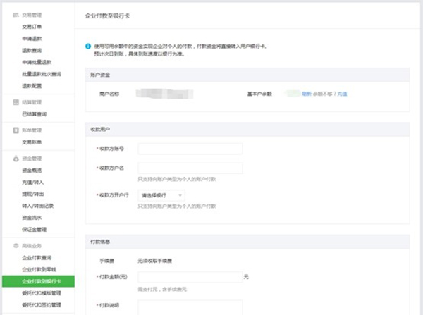 2.進入交易中心-企業(yè)付款到銀行卡頁面進行付款,API接口將在本周內(nèi)逐步開放。