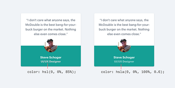 在白色背景下,合理的淡化視覺效果的做法是將黑色文本改成灰色,但這種方式在 彩色背景下并不適用。實際上,在白色背景下文本由黑變灰是為了降低對比度,但在彩色背景下,想要降低對比度是應(yīng)該讓文本逐步接近背景色,而并非改成灰色,若想要降低和背景色之間的對比,通常采用如下方式: