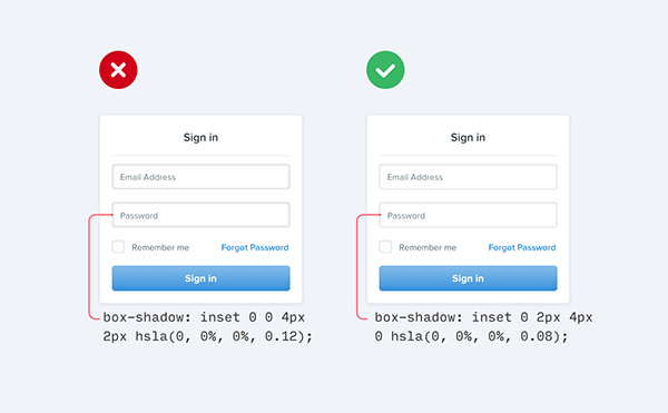 與大面積擴散模糊陰影相比,使用微妙的垂直偏移陰影效果更明顯,更自然,它模擬了最常見的光源特征,光線從上往下照下來從而營造陰影效果,如果你對此有興趣,Material Design Guideline非常清晰講述了這樣陰影的制作細節(jié)。
