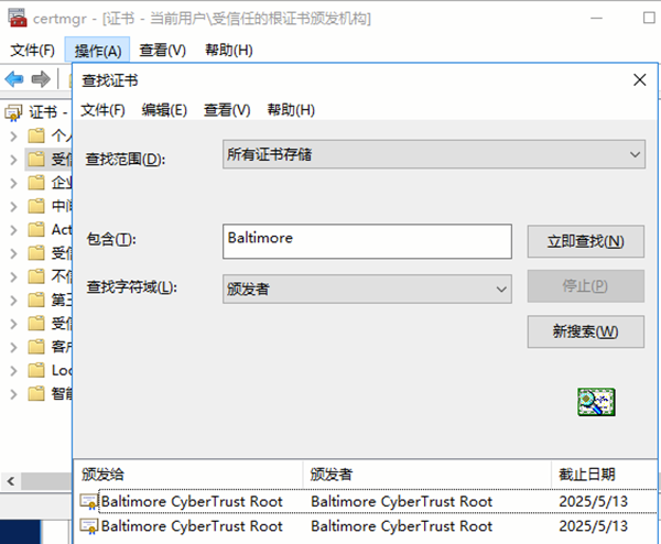 或者在控制臺窗口運行certmgr.msc,在操作菜單欄中打開查找證書,在所有頒發(fā)給域中搜索包含Baltimore,如果顯示有頒發(fā)給BaltimoreCyberTrustRoot的證書則不需要更新證書。