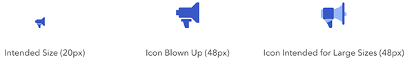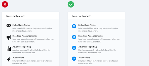 當設計著陸頁的時候,可以會突出產品的功能,這時你需要一些大的圖標作為視覺錨點,這樣的話你很可能會去 Font Awesome 或 Zondicons 這樣的網站找?guī)讉€免費的矢量圖標,然后將其放大到你所需要的尺寸。雖說矢量圖可以無損的放大,但是一個通常只有16×16 的圖標放大三四倍,它固然無損,但是在視覺上就顯得頗為不專注了:缺乏細節(jié),總感覺過于矮胖。