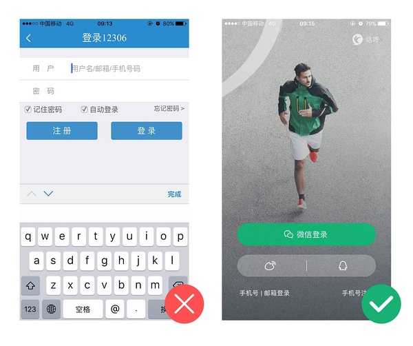 美學在設計產品的使用上扮演著重要的角色。美的設計能促進人們形成正面積極的態(tài)度,而且讓人們對產品設計上的缺陷更具有包容性。如:同樣都是登錄頁面我們更容易接受右面的設計,并且我們會通過是否美觀推斷右面的APP應該更好用,畢竟一個好用的APP應該都會好好“打扮”一下吧!