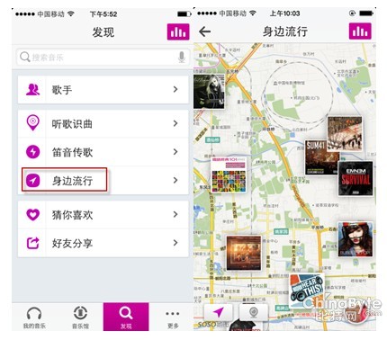 在“發(fā)現(xiàn)”模塊中的身邊流行功能,采用了地圖的模式??梢栽诘貓D上顯示身邊用戶在聽的歌曲,點(diǎn)擊歌曲即可試聽該歌曲,不得不說這是很有意思的一個(gè)功能。