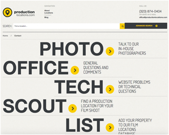 看起來好看的網(wǎng)頁頁面設(shè)計(jì)并不能說是一個(gè)成功的網(wǎng)站設(shè)計(jì),最主要的是能夠迎合用戶,能夠有良好的用戶體驗(yàn),是屬于用戶友好型的。如:Productiong Location的聯(lián)系我們頁面采用了大膽而視覺化的頁面設(shè)計(jì),但是和其他的同類頁面不同的是,它簡化了溝通流程,把用戶可能會關(guān)注的內(nèi)容和需要溝通的具體部分都劃分了一下,讓不同需求的用戶直接被引導(dǎo)到特定的頁面和部分,從而達(dá)成簡化和分流的目的。
