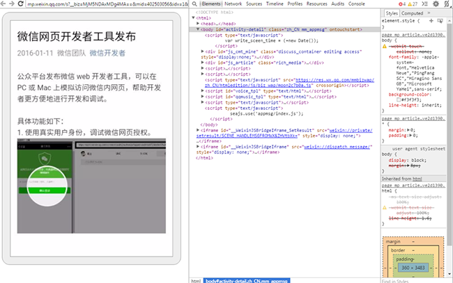 為此,微信 web 開發(fā)者工具同步推出0.5.0版本,繼支持測試號、企業(yè)號、第三方平臺開發(fā)者的使用之后,新增支持實時映射手機(jī)屏幕到 PC 或者 Mac 上,可以遠(yuǎn)程調(diào)試 X5 Blink 內(nèi)核上的網(wǎng)頁。