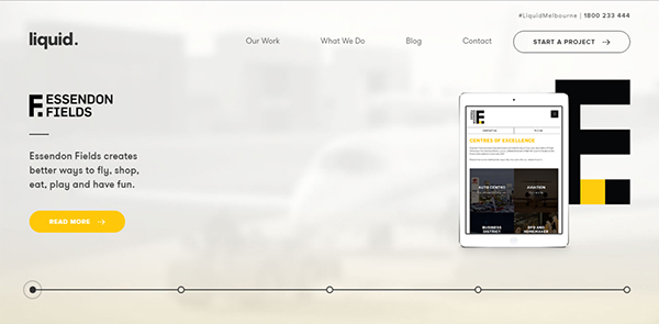 Liquid Agency 最拿手的就是在創(chuàng)造獨特的品牌體驗上,這一點從他們的官網(wǎng)上就可以看出來,黑白灰+提亮的黃色,橫向瀏覽的布局和恰到好處的留白,都是網(wǎng)站令人過目不忘的細節(jié)。