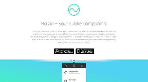 很多的時候當設計師沒有靈感時,會選擇去一些有情調(diào)的地方,如:咖啡廳來尋找創(chuàng)作的氛圍,Noizio將能夠很好的幫你將這種氛圍帶到家中。Noiz.io提供了十月雨聲、喧鬧的巴黎咖啡廳、雷雨聲等10種不同的白噪音音效,不僅如此,設計師還能夠依據(jù)用戶要求,或者是用戶的喜好來隨時的混搭音效。