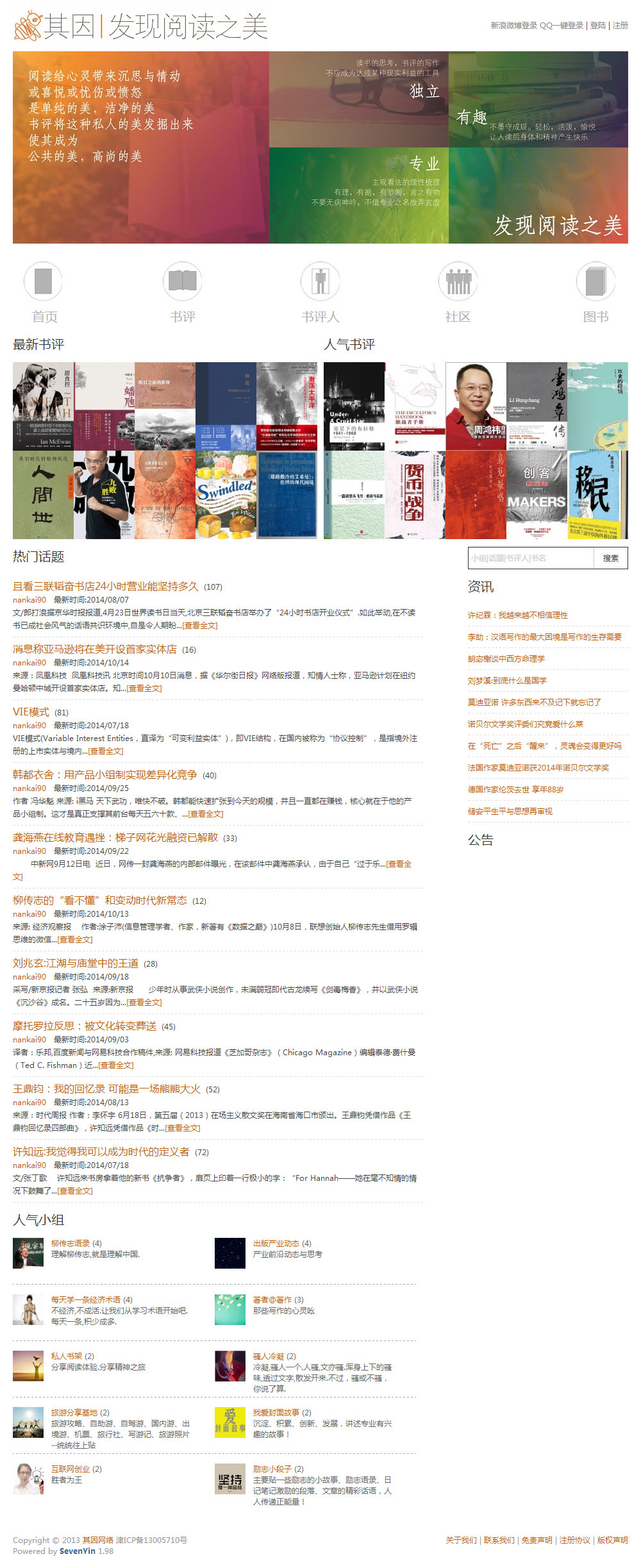 其因網(wǎng)(原:七印網(wǎng))是一個(gè)聚合讀書人關(guān)于書的思考、意見、評價(jià)的社區(qū),是一個(gè)聚合讀書人的社區(qū),還是一個(gè)聚合讀書人在讀書之外的喜怒哀樂的社區(qū)。因此,其因網(wǎng)(原:七印網(wǎng))是一個(gè)專門的書評社區(qū)。