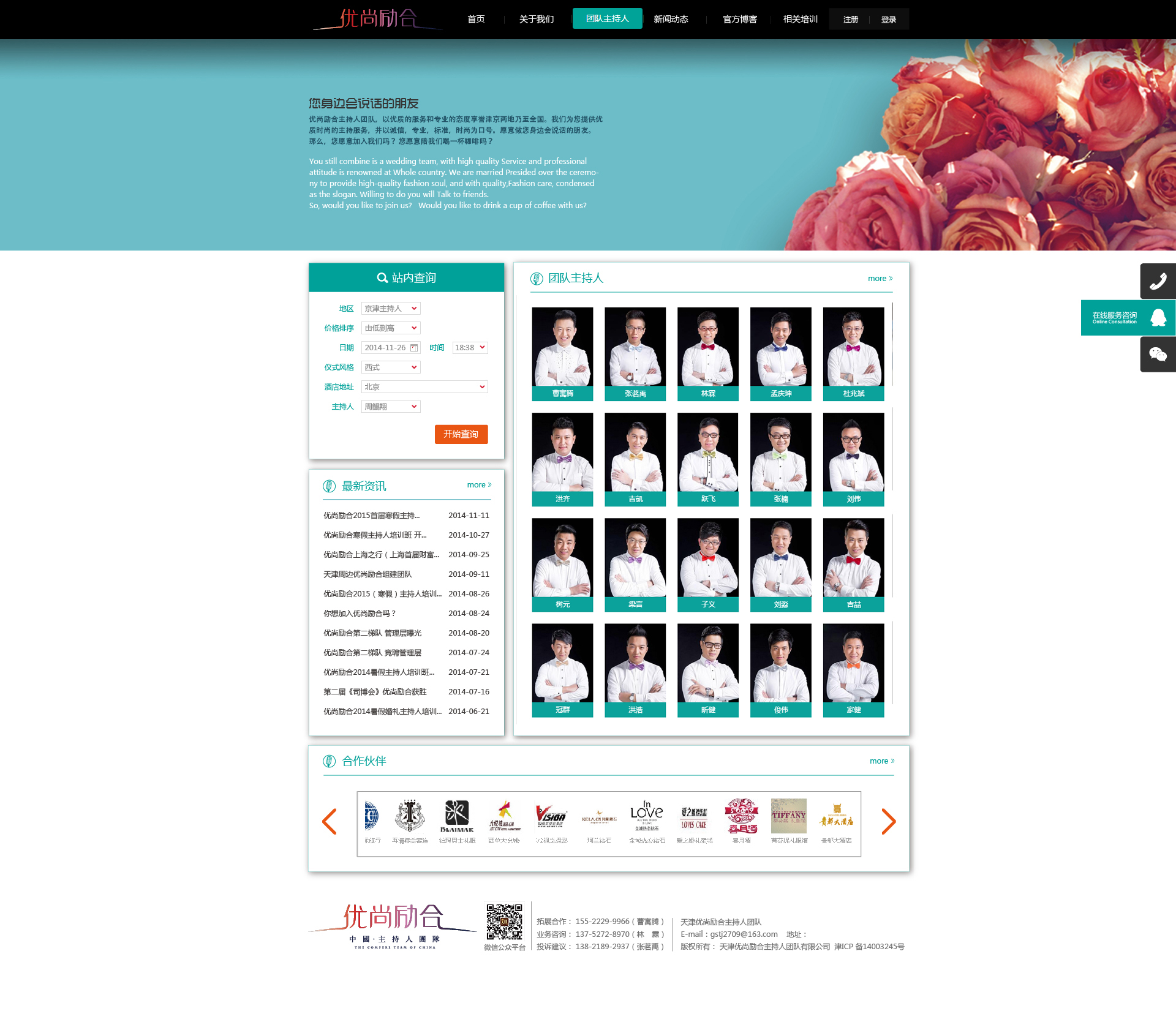 優(yōu)尚勵合主持人團隊(簡稱優(yōu)尚團隊),隸屬于天津優(yōu)尚勵合文化發(fā)展有限公司。受中國婚慶產業(yè)聯合集團、天津市婚慶服務行業(yè)協會的指導下,在潘樹輝、賈金奎、張宏達三位國內大師的精心指導下,由曹寓騰、張茗禹兩位國內資深婚禮主持人共同創(chuàng)辦。團隊本著鼓勵個性、支持原創(chuàng)、繼承傳統、開拓創(chuàng)新的發(fā)展方向,旨在全心全意為全國市場培養(yǎng)和提供優(yōu)秀的主持以及策劃服務。