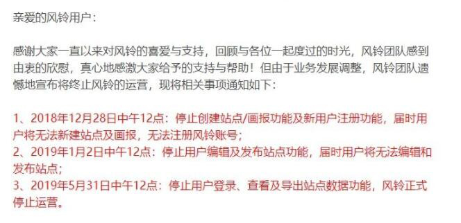 1、2018年12月28日中午12點(diǎn):停止創(chuàng)建站點(diǎn)/畫(huà)報(bào)功能及新用戶注冊(cè)功能,屆時(shí)用戶將無(wú)法新建站點(diǎn)及畫(huà)報(bào),無(wú)法注冊(cè)風(fēng)鈴賬號(hào);