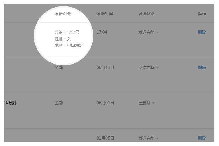 點擊“群發(fā)功能”-“已發(fā)送”可查看已群發(fā)消息,新增該消息對應的發(fā)送對象的分組、性別和地區(qū)信息。