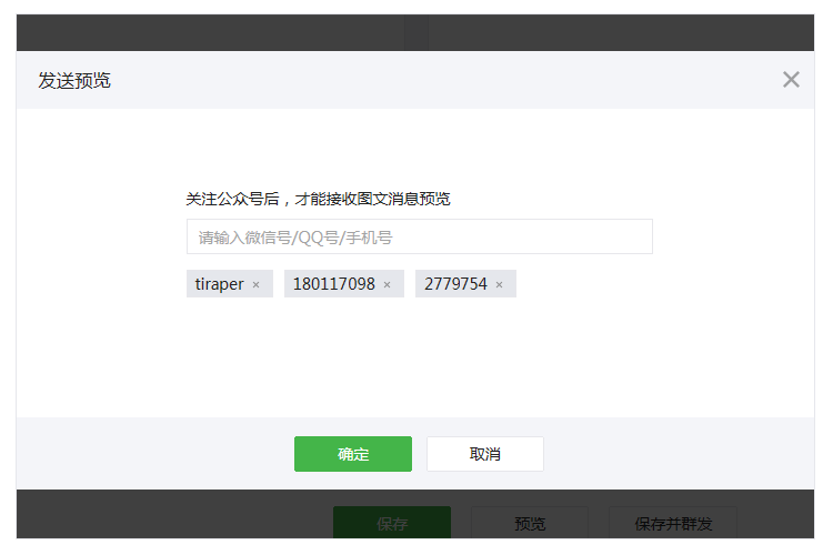 編輯圖文消息時,點擊“預覽”按鍵,除可輸入微信號發(fā)給需要預覽的微信用戶外,新增支持已綁定微信號的手機號和QQ號。