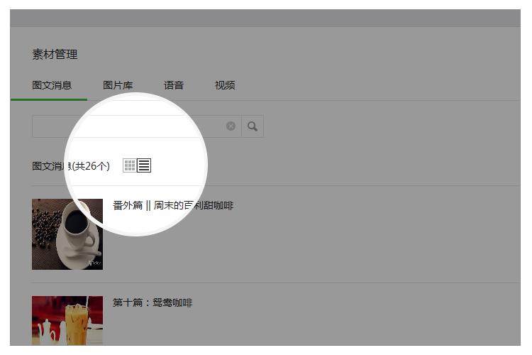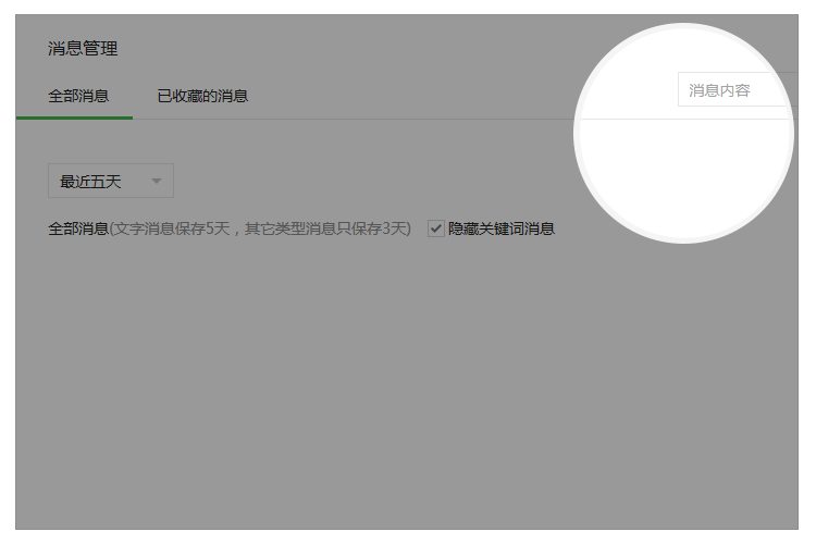 除用戶管理的搜索功能外,素材庫圖文消息和消息管理的搜索功能體驗上保持一致,輸入框內(nèi)提示已支持的搜索內(nèi)容。