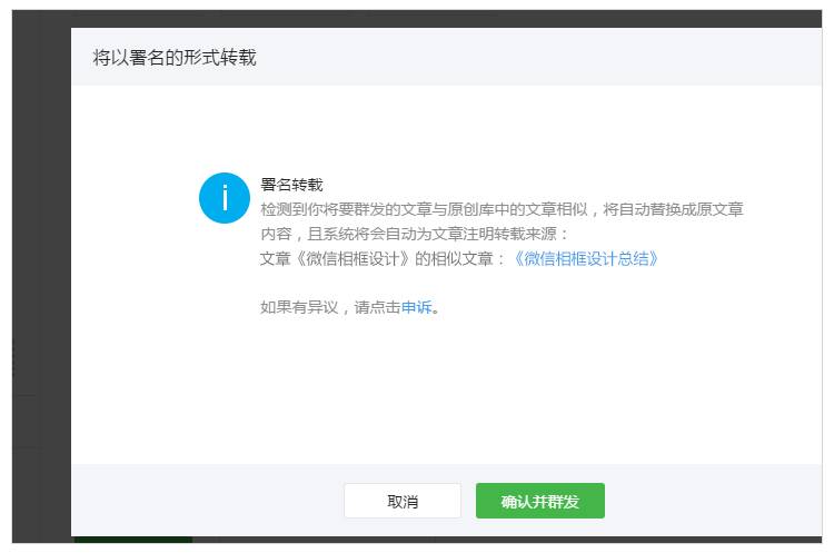 2. 設(shè)置為允許轉(zhuǎn)載的文章在群發(fā)后,其他公眾號(hào)轉(zhuǎn)載時(shí)無法修改原文章內(nèi)容及排版等,系統(tǒng)自動(dòng)為轉(zhuǎn)載文章注明出處,且將默認(rèn)所有公眾號(hào)獲得了作者的轉(zhuǎn)載授權(quán)。所有依據(jù)本功能轉(zhuǎn)載的文章,原創(chuàng)作者再行投訴轉(zhuǎn)載者抄襲侵權(quán)將不被支持。