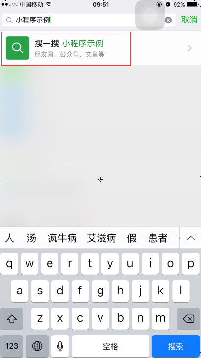 2、在微信的⑴個(gè)頁(yè)面頂端,有一個(gè)搜索條,在搜索條里輸入:小程序示例,然后點(diǎn)擊搜索。