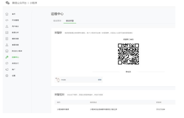 在運(yùn)維中心,開(kāi)發(fā)者可掃描二維碼加入小程序報(bào)警群。當(dāng)小程序在運(yùn)行中出現(xiàn)問(wèn)題時(shí),系統(tǒng)會(huì)推送信息告知報(bào)警群內(nèi)的成員。