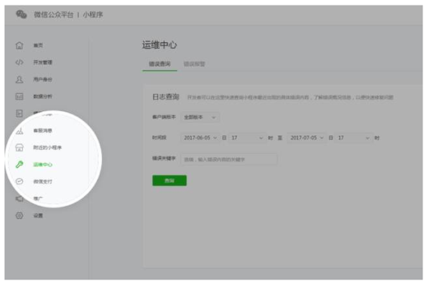 為了幫助開(kāi)發(fā)者及時(shí)發(fā)現(xiàn)小程序運(yùn)行中出現(xiàn)的問(wèn)題,公眾平臺(tái)新增小程序運(yùn)維中心。開(kāi)發(fā)者可以在運(yùn)維中心查詢小程序最近30天內(nèi)出現(xiàn)的錯(cuò)誤信息,快速修復(fù)問(wèn)題。