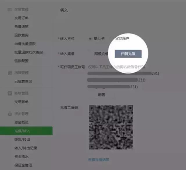 電腦登錄微信支付商戶平臺(tái)-交易中心 - 充值轉(zhuǎn)入,選擇轉(zhuǎn)入方式為“掃碼充值”,根據(jù)頁面操作流程進(jìn)行充值;