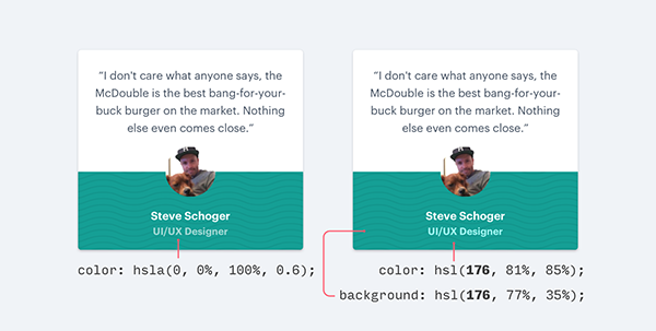 在白色背景下,合理的淡化視覺效果的做法是將黑色文本改成灰色,但這種方式在 彩色背景下并不適用。實際上,在白色背景下文本由黑變灰是為了降低對比度,但在彩色背景下,想要降低對比度是應(yīng)該讓文本逐步接近背景色,而并非改成灰色,若想要降低和背景色之間的對比,通常采用如下方式: