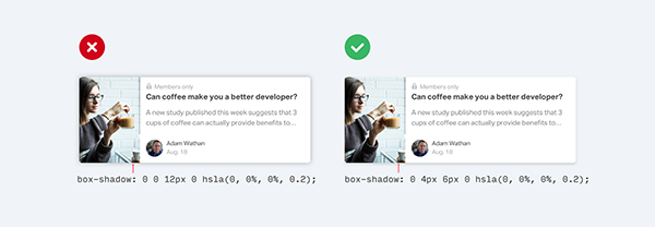 與大面積擴散模糊陰影相比,使用微妙的垂直偏移陰影效果更明顯,更自然,它模擬了最常見的光源特征,光線從上往下照下來從而營造陰影效果,如果你對此有興趣,Material Design Guideline非常清晰講述了這樣陰影的制作細節(jié)。