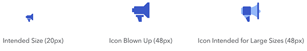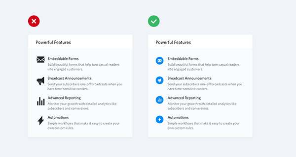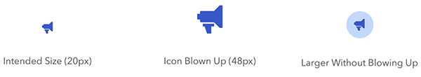 當(dāng)設(shè)計著陸頁時,可能會突出產(chǎn)品的功能,這時你需要一些大圖標(biāo)來作為視覺錨點,F(xiàn)ont Awesome或Zondicons 這樣的網(wǎng)站能幫你找到免費的矢量圖標(biāo),然后放大到符合你需求的尺寸。由于他們是矢量圖片,放大無損,但是通常16×16 的圖標(biāo)放大三四倍,雖然無損,但在視覺上就顯得不專注:缺乏細節(jié),總感覺過于矮胖??墒?,如果這些小圖標(biāo)是你唯一能夠搞得到的素材的話,那么不妨試著將它置于另外一個帶有顏色的圖形當(dāng)中: