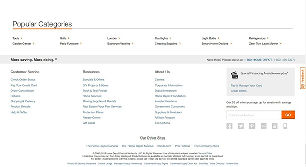 包含大量、不同的內(nèi)容的網(wǎng)站,應(yīng)該考慮將大量的鏈接按照類別進(jìn)行分組管理,通過有組織的鏈接,可幫助用戶找到他們想要的相關(guān)的內(nèi)容。對于大型項(xiàng)目而言,這是一種很常見的技術(shù),對于用戶而言,可能非常有用。以 Amazon為代表的這些在線零售巨頭對于在頁腳中組織信息就有著豐富的經(jīng)驗(yàn),在The Home Depot 的網(wǎng)頁中,頁腳就包含了多層次的頁腳導(dǎo)航。