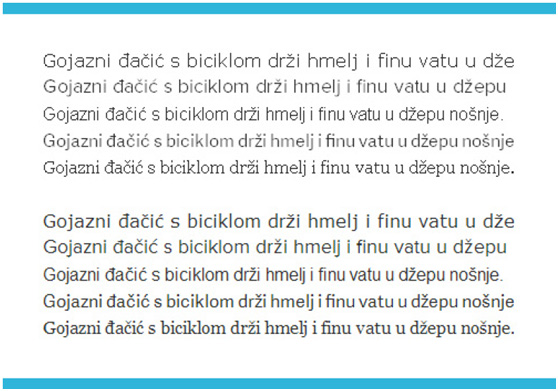 另外一個重要的易讀性測試是為了區(qū)分簡單字體字形之間的區(qū)別。設(shè)計(jì)師使用全字母短句,或測試短語來評估和對比字體。比如有名的短語“The quick brown fox jumps over the lazy dog”、“Handgloves”、“Hamburgefonstiv”。