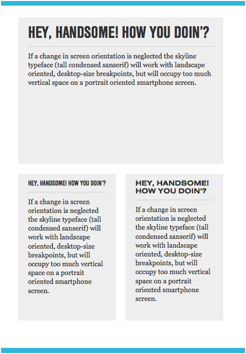 如果忽略屏幕方向和屏幕分辨率的變化,那么頂端skyline由多個字詞組成的標(biāo)題(比如說瘦長的無襯線字體)應(yīng)該能夠?qū)M向電腦桌面大小的節(jié)點(diǎn)起很好的作用,但在智能手機(jī)直式方向上可能會占用太多垂直空間,尤其是原文一行的標(biāo)題在智能機(jī)上要轉(zhuǎn)成兩行。雖然調(diào)小字體大小來調(diào)整有一定作用,但是效果未必能比在臺式電腦的文本清晰。