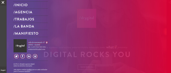 Drygital的主菜單流露出歡樂積極的情感。華麗鮮艷的漸變背景,非常有利于展現(xiàn)亮白色的導(dǎo)航。一如往常,菜單覆蓋了整個主頁。不過得益于半透明的背景,用戶可以在著陸頁欣賞一段視頻。