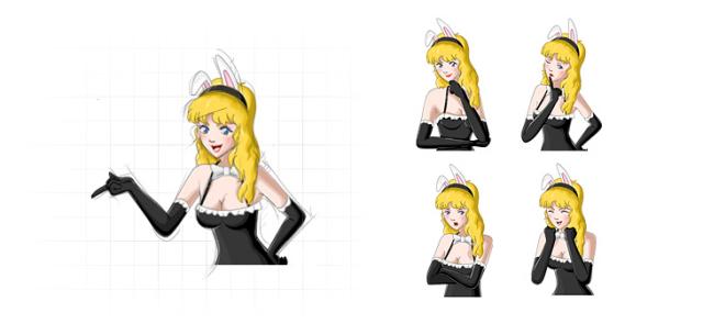 隨后考慮到形象的多場景應用問題,又增加了兔女郎俏皮、興奮、失望等表情動作。并計劃在后期的設(shè)計中增加兔女郎的人物個數(shù),塑造3個不同性格不同風格的兔女郎形象來滿足不同用戶的喜好。