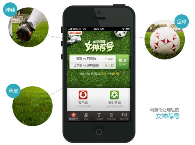 易迅彩票作為趣味化導向的產(chǎn)品,在保證功能簡單好用的前提下,適當?shù)募尤雸鼍盎O(shè)計,能夠很好地提升頁面的娛樂性。因為相比于傳統(tǒng)的單純功能性購彩頁面,通過場景化設(shè)計后的頁面更具視覺感染力和使用帶入感。因此我們在競彩足球彩種的女神推薦欄目和購彩頁面嘗試運用了場景化設(shè)計的手法。