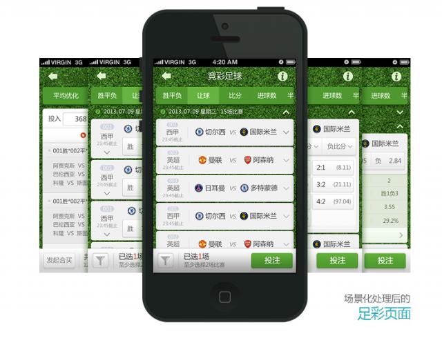 競彩足球的購彩頁面則由于展示信息量大和操作區(qū)域相對固定的原因,只能延續(xù)足球的草地場景,舍棄了其他視覺元素。盡管如此加入了足球場背景,強化了足球氛圍的頁面,更容易引起足球彩民的共鳴。