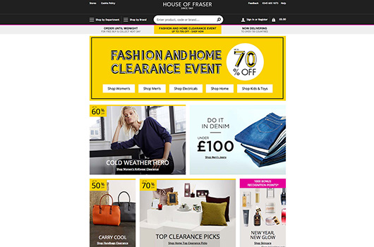 隱藏式菜單在電商類網(wǎng)站中的作用是非常重要的,巧妙的利用隱藏式菜單能夠清理電商網(wǎng)站雜亂的版面,最初它們是為移動端設(shè)計(jì)的,但現(xiàn)在也越來越多用在桌面端的設(shè)計(jì)中。2015年,許多在線銷售商在大大小小的屏幕上都使用了隱藏式導(dǎo)航菜單,節(jié)省了大量屏幕空間,這個(gè)趨勢在2016還會持續(xù)增長。如今,互聯(lián)網(wǎng)中很多知名在線商城都使用了隱藏式菜單,如:House of Fraser。