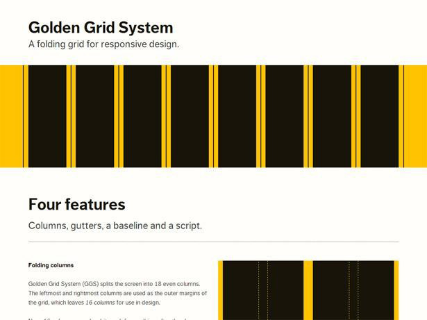 Joni Korpi的開發(fā)和Less Framework是同一人,近期已經(jīng)發(fā)布了這個可靠的Grid系統(tǒng)的新版本。因為其易于適應(yīng)從16個到8個到4個欄,被視為“折疊式”。Golden Grid System還具有另一個特色,可以在測試時用一個小型瀏覽器覆蓋您所制作的頁面上的Grid。