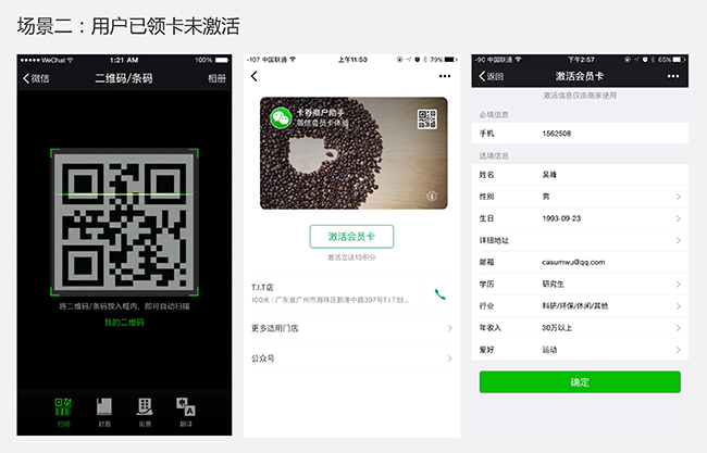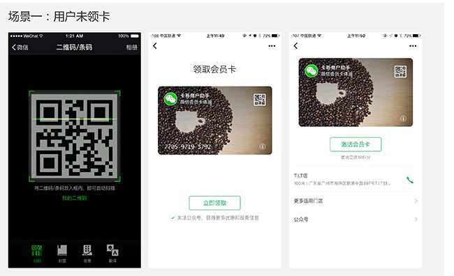 新版會員卡將多種功能集合在一個二維碼上:未領(lǐng)卡用戶掃碼后,領(lǐng)取頁面將默認(rèn)勾選關(guān)注公眾號選項,用戶點擊立即領(lǐng)取后,將在領(lǐng)卡同時關(guān)注商家公眾號;領(lǐng)卡未激活用戶掃碼后引導(dǎo)激活;已領(lǐng)卡并激活的會員用戶掃碼可直達(dá)卡面,進(jìn)行支付、查看積分等商家設(shè)置的操作。