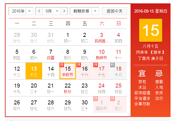 1、放假時(shí)間:2016年9月15日至9月17日放假,共3天。9月15日(星期四,農(nóng)歷中秋節(jié)當(dāng)日)為國家法定節(jié)假日;9月17日(星期六)公休;9月18日(星期日)公休調(diào)至9月16日(星期五);9月18日(星期日)照常上班。