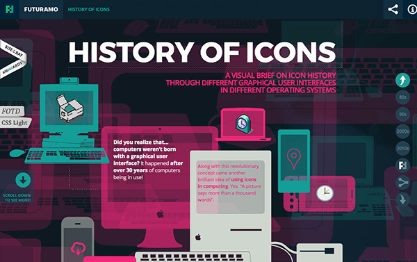 圖標設(shè)計需要契合整個設(shè)計策略,仔細審視你所需要設(shè)計的內(nèi)容和風格,再將圖標和流行的元素結(jié)合起來,營造出符合現(xiàn)代風格的美學特征。另外,圖標最大的特性就是它具有靈活性,它從形狀到細節(jié)都可以充滿藝術(shù)性,從手繪風到扁平化,從精致擬物到藝術(shù)化處理都很容易實現(xiàn)。而上面這個關(guān)于圖標歷史的網(wǎng)站就展示了多年來圖標風格的演變,這些圖標所呈現(xiàn)出來的風格、色彩、使用方法和規(guī)格都非常值得設(shè)計師們研究學習。