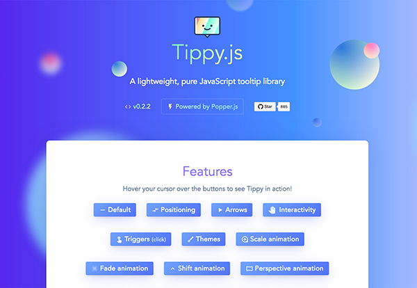 Tippy是一款輕量級(jí)的純JS工具提示庫(kù),其中包含了大量不同的交互相關(guān)的提示內(nèi)容,它的出現(xiàn)對(duì)設(shè)計(jì)師的工作有很大的幫助,并且它的兼容性非常的好,幾乎可以適用于任何瀏覽器,這也使得它幾乎可以輕松實(shí)現(xiàn)各種各樣的提示效果。
