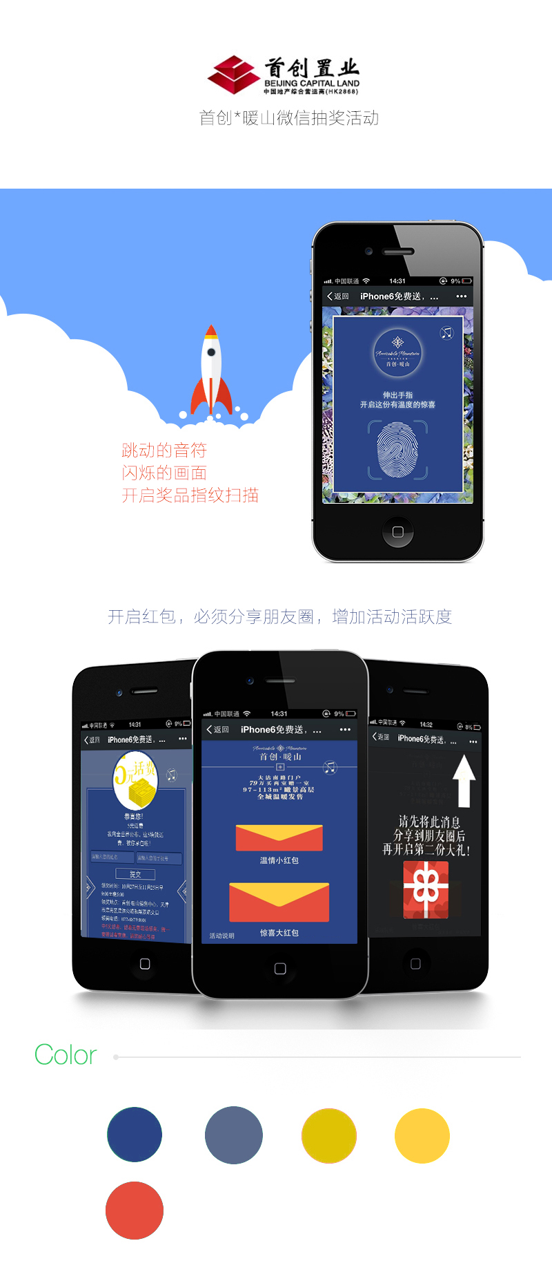這是一款針對企業(yè)做活動,抽獎引起轉(zhuǎn)發(fā)朋友圈,來提高企業(yè)活動曝光率和活動的活躍度,打開頁面,有音樂響起,閃爍的logo效果,指紋掃描參與抽獎,打開⑴個紅包,抽中獎品以后填寫姓名—電話。如果需要打開第二個紅包,必須分享朋友圈。