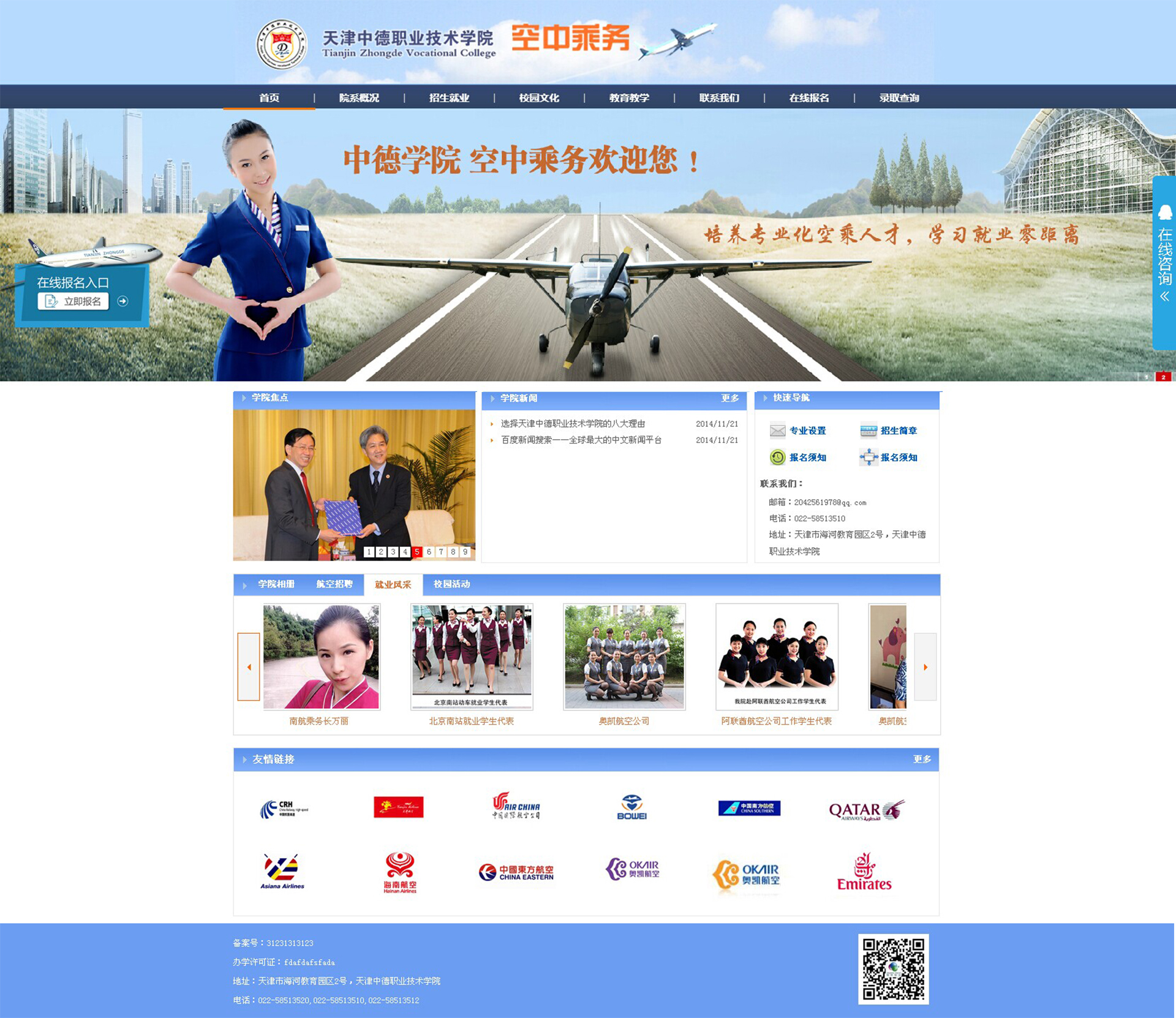 學(xué)院以國(guó)際合作為依托,校企合作為支撐,按照企業(yè)提出的人才培養(yǎng)目標(biāo)和知識(shí)能力結(jié)構(gòu),校企共同制定人才培養(yǎng)計(jì)劃,師資、技術(shù)、辦學(xué)條件合作共享、工學(xué)交替進(jìn)行,學(xué)生畢業(yè)直接到用人單位就業(yè),企業(yè)避免了人才選擇的盲目性,學(xué)生就業(yè)有了保障,是有利于擴(kuò)大就業(yè)的高技能人才培養(yǎng)模式。該校特色專(zhuān)注空中乘務(wù)與航空服務(wù)注重理論和實(shí)踐相結(jié)合,開(kāi)展多證教育,擁有高配置的計(jì)算機(jī)室、語(yǔ)音室、形體訓(xùn)練室、禮儀化妝室、飛機(jī)模擬艙等教學(xué)設(shè)施。與此同時(shí),我們通過(guò)校企合作,與多家企業(yè)以形成“訂單式”培養(yǎng)的模式。為在校生提供了安全、高薪的民航相關(guān)工作。目前已為國(guó)內(nèi)外各大航空公司、機(jī)場(chǎng)等輸送畢業(yè)生達(dá)8000多名畢業(yè)生,贏得了民航總局及學(xué)生家長(zhǎng)的一致認(rèn)可與好評(píng),被譽(yù)為業(yè)內(nèi)奇跡。